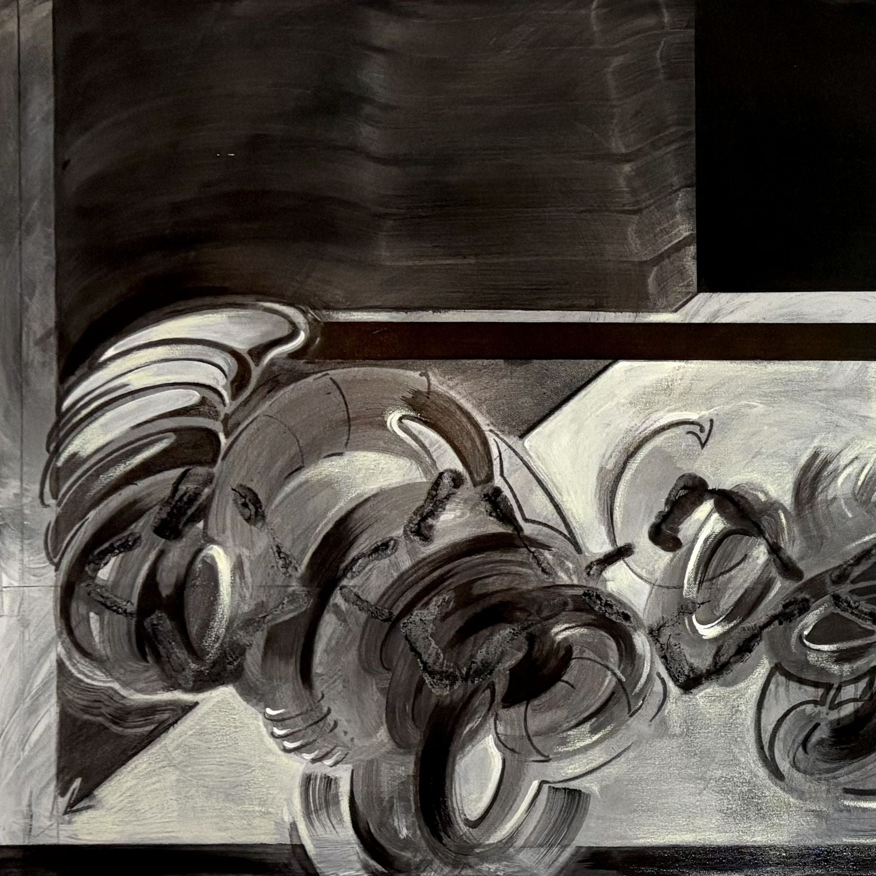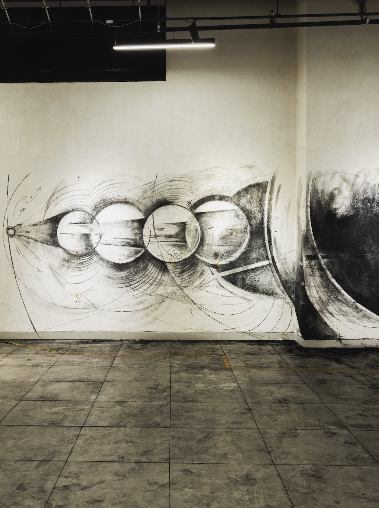 Working primarily in charcoal, I operate as a feedback loop creating an intermingling dance of intuition and analysis. Displacing the body to points of fatigue, the lines that emerge are not illustrations but residues of contact, prescribed to be in motion to make circular and elliptical tracings that mirror the arcs of arms, shifts of weight, and altered breath. The body becomes the reference for measurement. The wall becomes a membrane; the floor becomes a graph. Space is not a static backdrop but rather an active field.